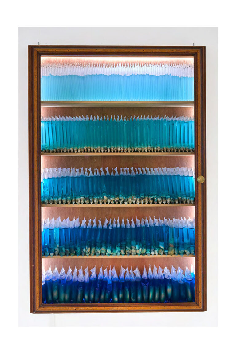 Anne-Laure Wuillai s’est éprise de la Mer Méditerranée et de ses bleus azurs, par réflexe poétique et pour veiller sur elle. L’artiste en prélève des échantillons – sédiments et plastiques en suspension inclus – qu’elle étiquette rigoureusement. À l’instar des protocoles scientifiques et des logiques industrielles, elle enferme ses prélèvements, comme autant de mers miniatures qu’elle accumule en sachets de toutes dimensions ou en tubes de laboratoire. Pour en signifier la valeur, elle abrite parfois ses collectes dans des boîtes précieuses et de petits mobiliers chinés… Avec délicatesse, elle dénonce autant qu’elle préserve et nous renvoie à notre enfance, où accroupis sur les plages, nous ramassions galets et petits coquillages en collections, comme des petits bouts de notre présence au monde.