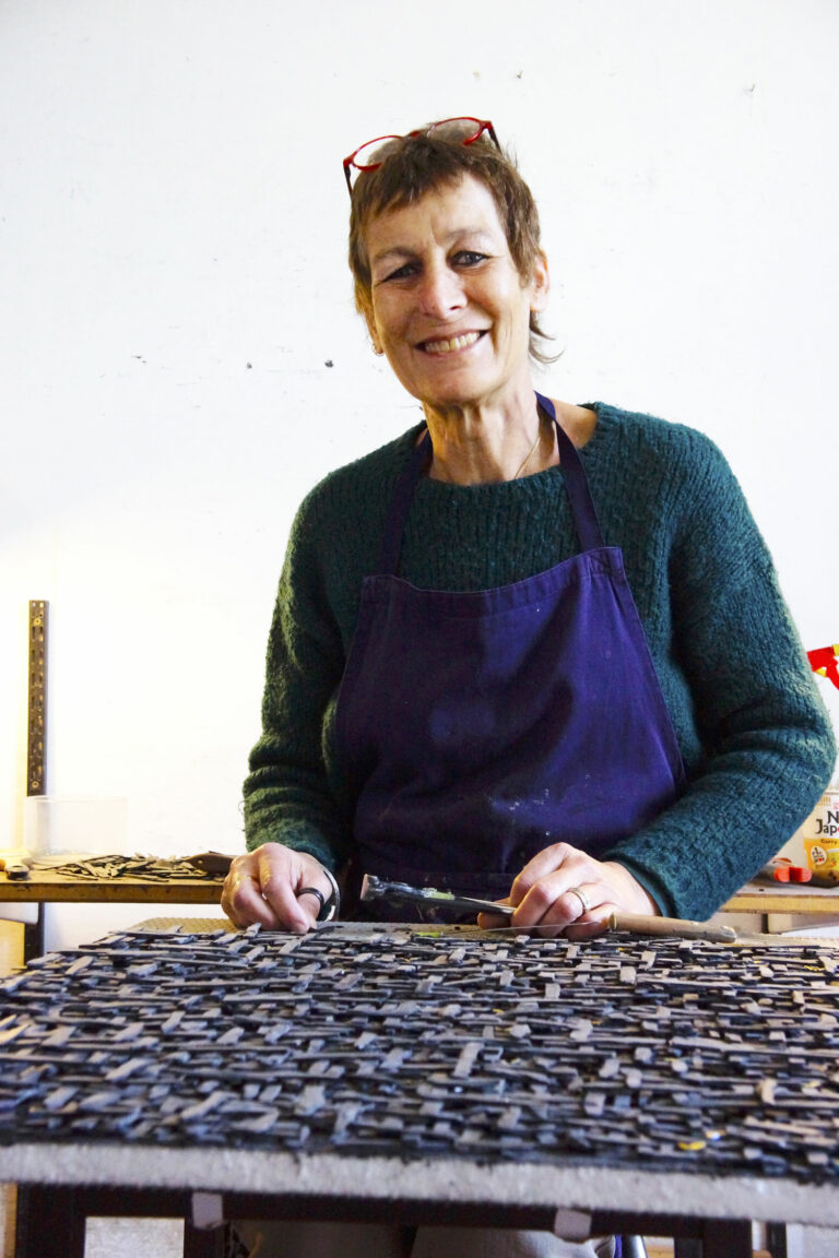 Mosaïste, Caty Laurent assemble de petits fragments d’ardoise qu’elle associe parfois à de l’or, et crée des ensembles symboliques, souvent chargés de messages poétiques et militants. Par des compositions libres et d’une grande finesse, elle prend la destination et la densité de ce matériau à revers. Ses installations mobiles, et ses assemblages qu’elle appréhende comme des tableaux, sont marqués par une recherche graphique forte, laissant à cette roche métamorphique l’arbitraire de tranches de gris et de noirs qu’elle agence par de minutieux gestes répétés.